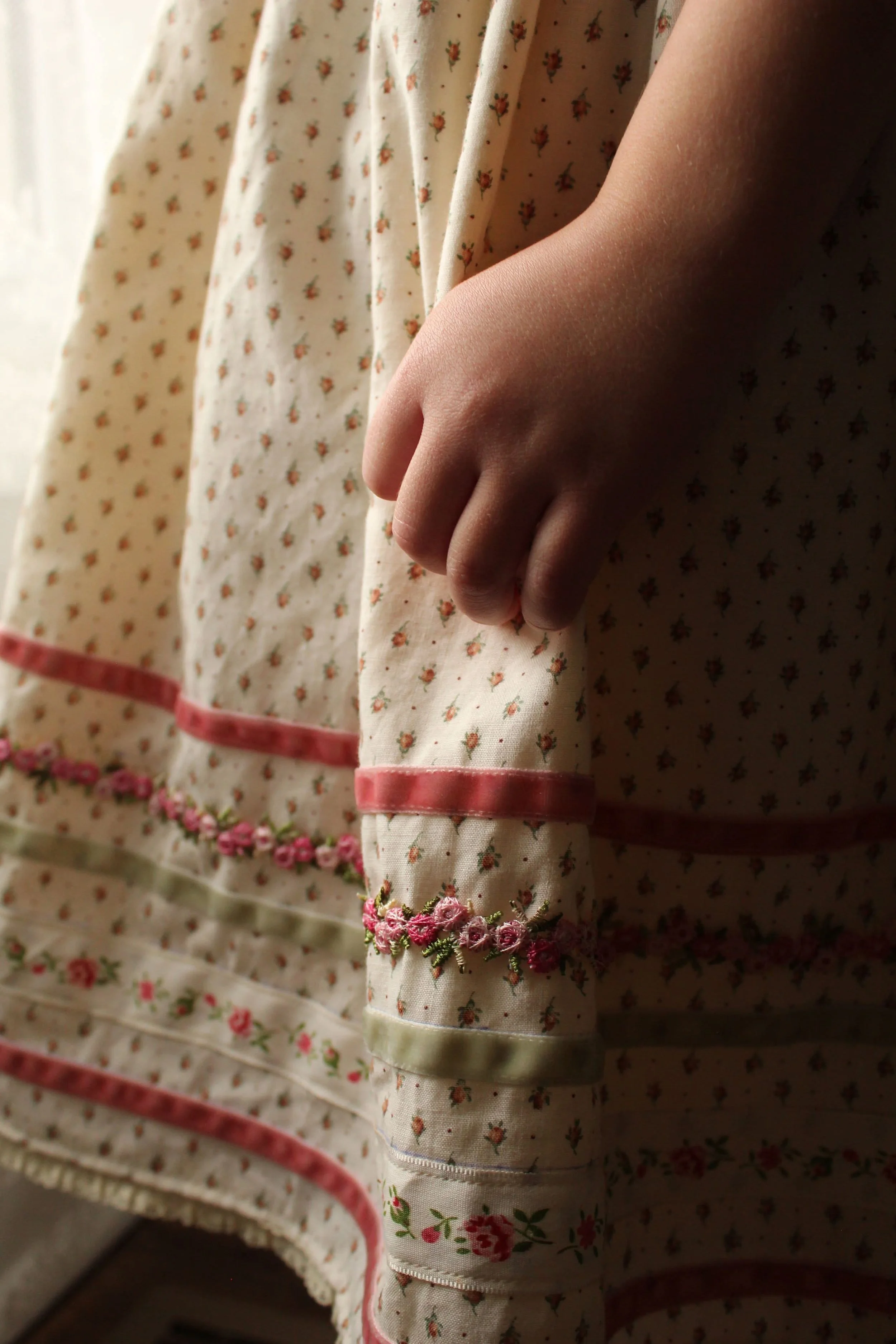 —I’m always happy to give you a price estimate before you commit to a piece, but I ask for series inquiries only. Example pricing: A simple 5T Anne with a straight skirt at regular length without lace is $118, a Victoria size 10 dress with a large lace ruffle and velvet accents at a maxi length made in a vintage floral with fabric covered buttons is $198. These examples show that prices depend on the amount of time your piece will take to complete, the amount of detailing, and the materials needed.