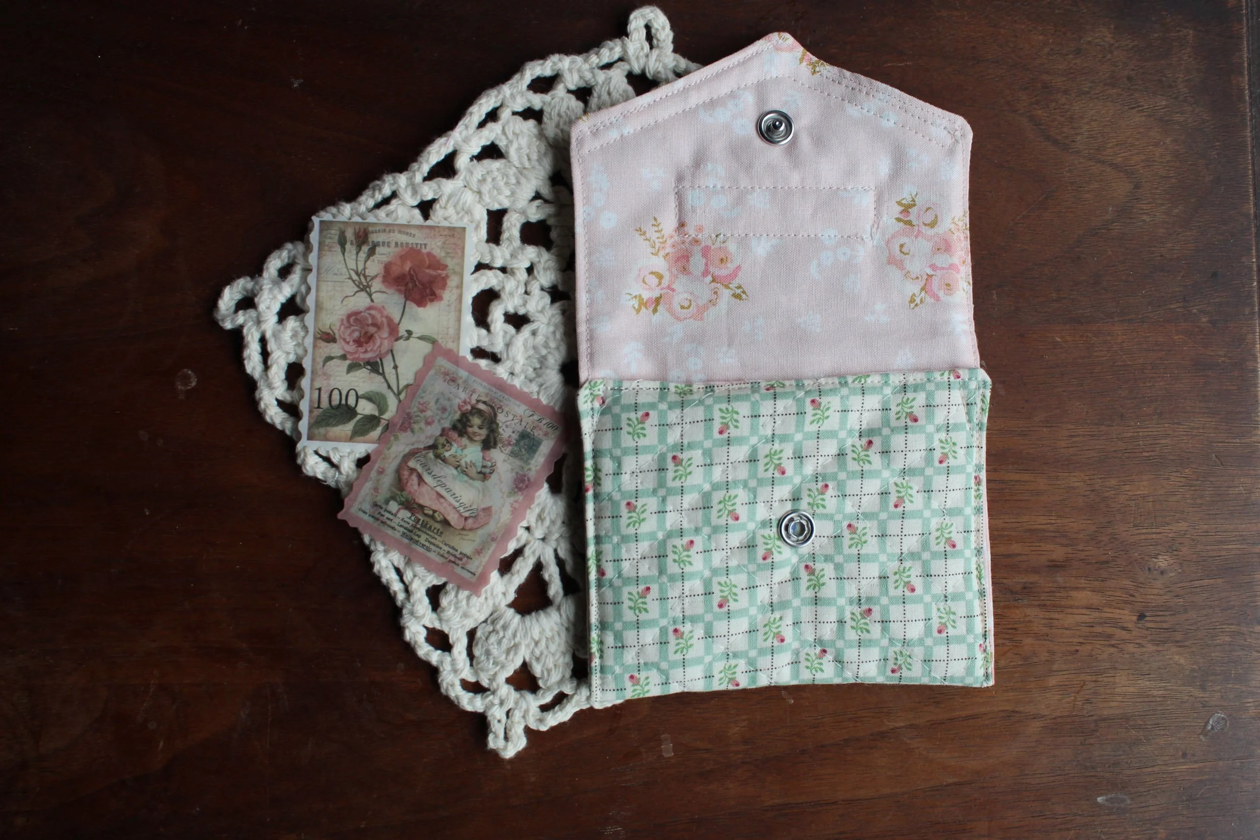 This sweet coin purse is handcrafted using authentic vintage 1980s fabric, paired with delicate lace trim that feels like it belongs to another time. Softly quilted and thoughtfully stitched, it has that heirloom charm—the kind you imagine tucked inside your grandmother’s handbag or resting on a bedside table.
